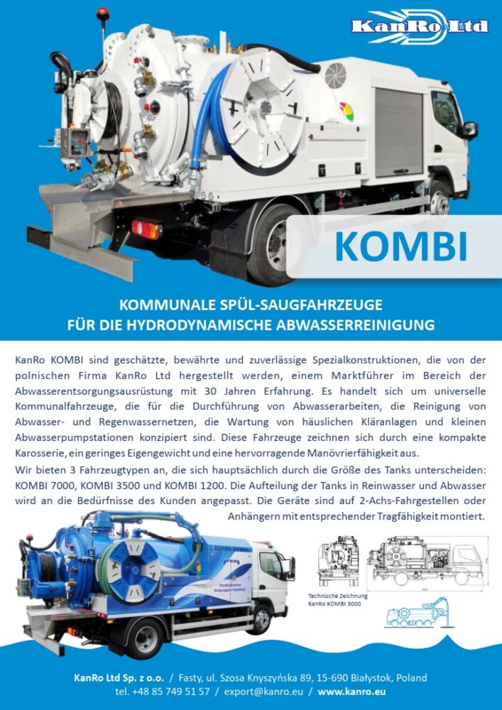 KanRo COMBI 7000 Kanalreinigungsfahrzeug ist seit vielen Jahren eine bekannteste Konstruktion, die von KanRo Ltd® in Polen hergestellt und angeboten wird. Das Saug- und Spülkombinationsgerät verwendet Hochdruckwasserstrahlen in Kombination mit einer Hochstromvakuumquelle, um Rohre und Abwasserkanäle zu reinigen und anschließend das Material aufzusaugen, das den normalen Abwasserfluss wiederherstellt und aufrechterhält. Die Bedienung des Fahrzeugs wurde mit dem Schwerpunkt auf sichere und einfache Handhabung ausgelegt. Das Fahrzeug zeichnet sich durch eine kompakte Bauweise, geringes Eigengewicht und hervorragende Flexibilität aus. Natürlich erfüllt er alle Straßenverkehrsvorschriften einschließlich zulässigen Gesamtgewichte und Achslasten.