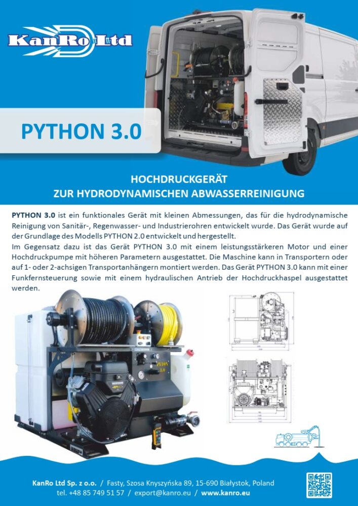 PYTHON 3.0 ist ein sehr funktionelles Reinigungsgerät mit kleinen Abmessungen, ausgelegt für die hydrodynamische Reinigung von Sanitär-, Regenwasser- und Industrierohren mit einem maximalen Durchmesser von bis zu 500 mm (je nach Version). Das Gerät wurde von KanRo Ltd® auf Basis langjähriger Erfahrung im Verkauf und Service von Hochdruckreinigungsgeräten entwickelt und hergestellt.